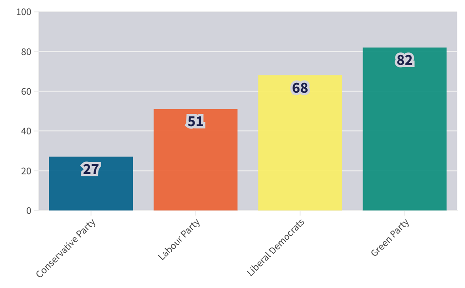 Friends of the Earth has assessed and rated the four main parties’ policies on climate, energy, nature and the environment, scoring them out of 10 on the 10 biggest issues. Unsurprisingly, the Greens come out on top, but it is interesting that the Conservatives score is much lower than Labour’s. This perhaps demonstrates the consequence of adjusting policies to take greater account of people’s finances and appreciating the fact that it can take time to change lifestyles and habits.